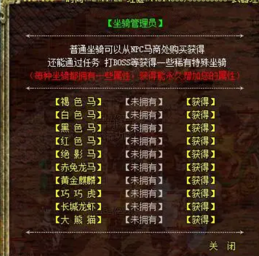 每只坐骑都拥有自己的属性,你获得他就能获得属性!