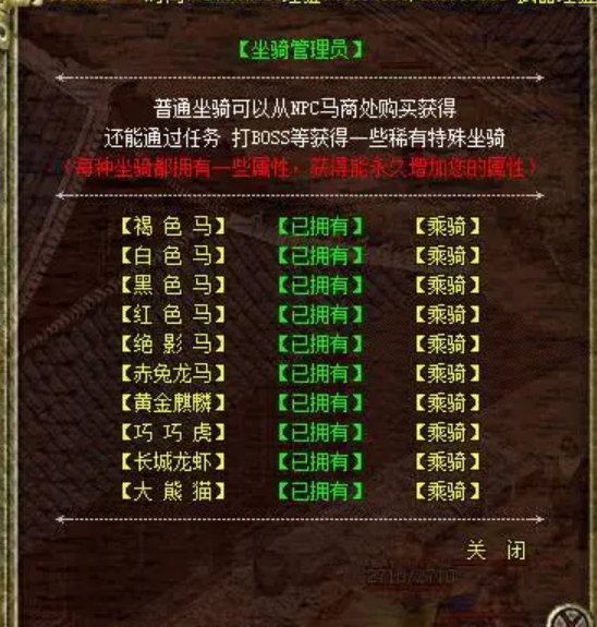 你可以拥有多种坐骑,根据自己的喜好随时换着骑!